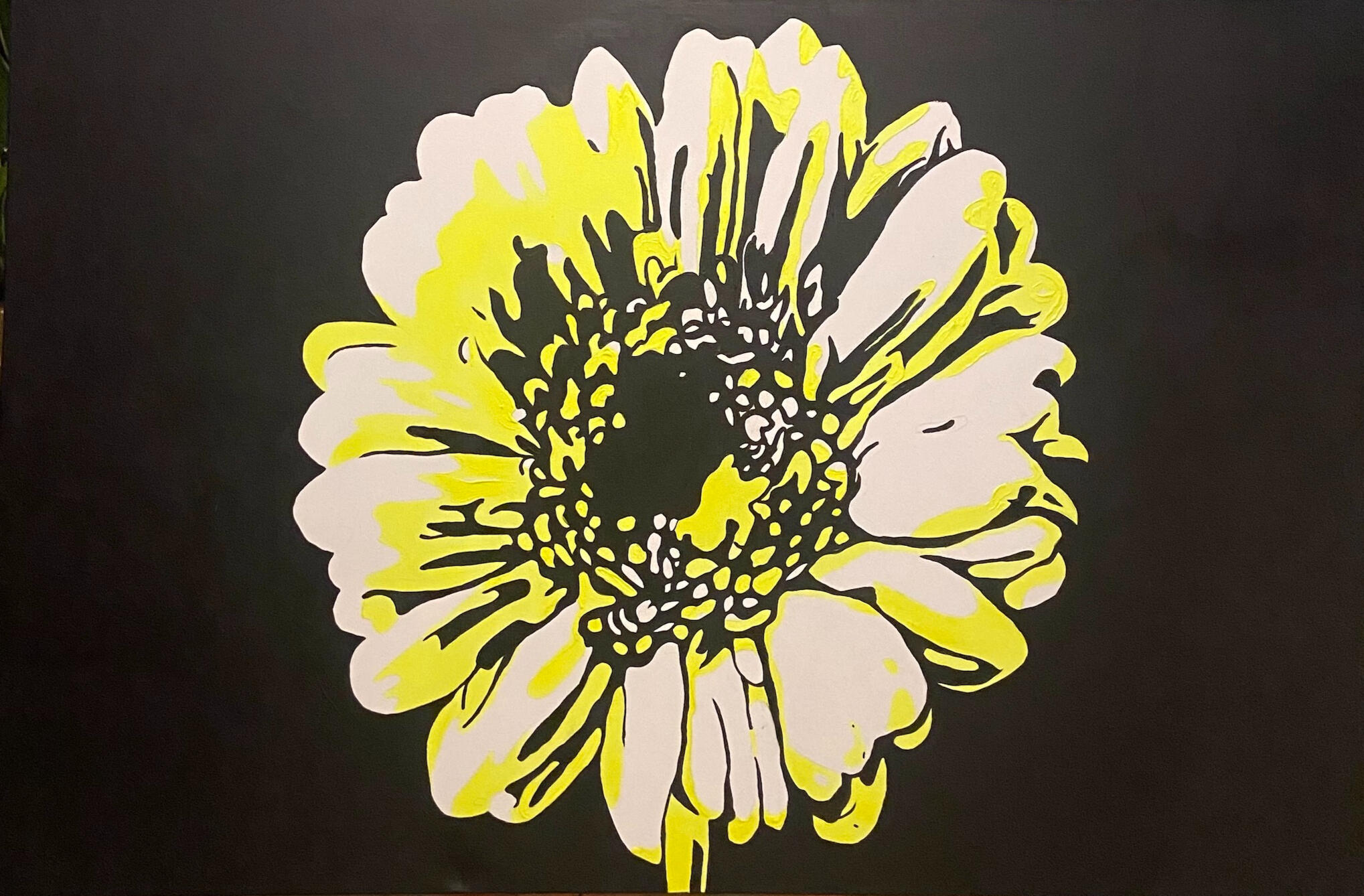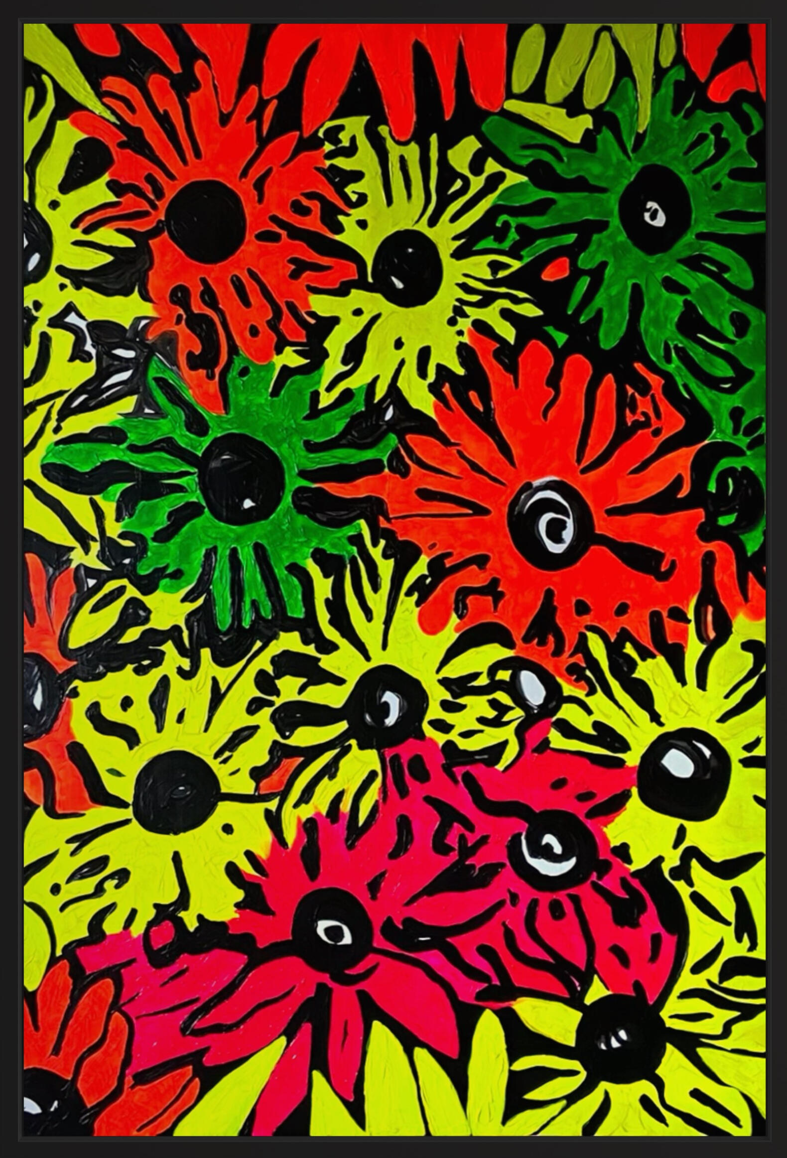 Neon BloomThis large-scale work is an explosion of organic energy and high-frequency color. Utilizing fluorescent pigments against a deep black relief, the piece reinterprets traditional floral forms as vibrant, pulsing icons.The use of neon paint ensures the colors remain exceptionally vivid in natural light, while transforming into a glowing, immersive experience under ultraviolet light. At 80x120cm, this statement piece is designed to command attention and bring a modern, electric vitality to any contemporary space.80x120